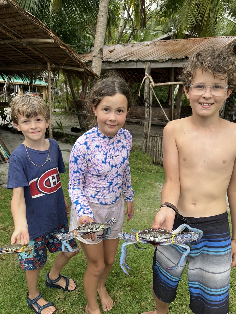 On our last day In Port Barton, we went to Alain’s chalet. That morning we left at 9:45. We went on the beach to look for a boat to bring us to the little village of Bunuangin. A man asked if we wanted to go to White Beach and we said no, but asked how many pisos it would be to go to Bunuangin. He said that his boss would tell us the price. He said 3000. But we found another boat for only 2000. When we arrived, we visited the village. After we went on the neighbour’s boat to go to the net to catch some fish and some crabs for lunch. We caught 6 crabs, 7 fish, one ray, and one squid (he had so much ink). We came back to the chalet to eat. We learned how to eat the crab and left the fish and ray for the neighbour.
