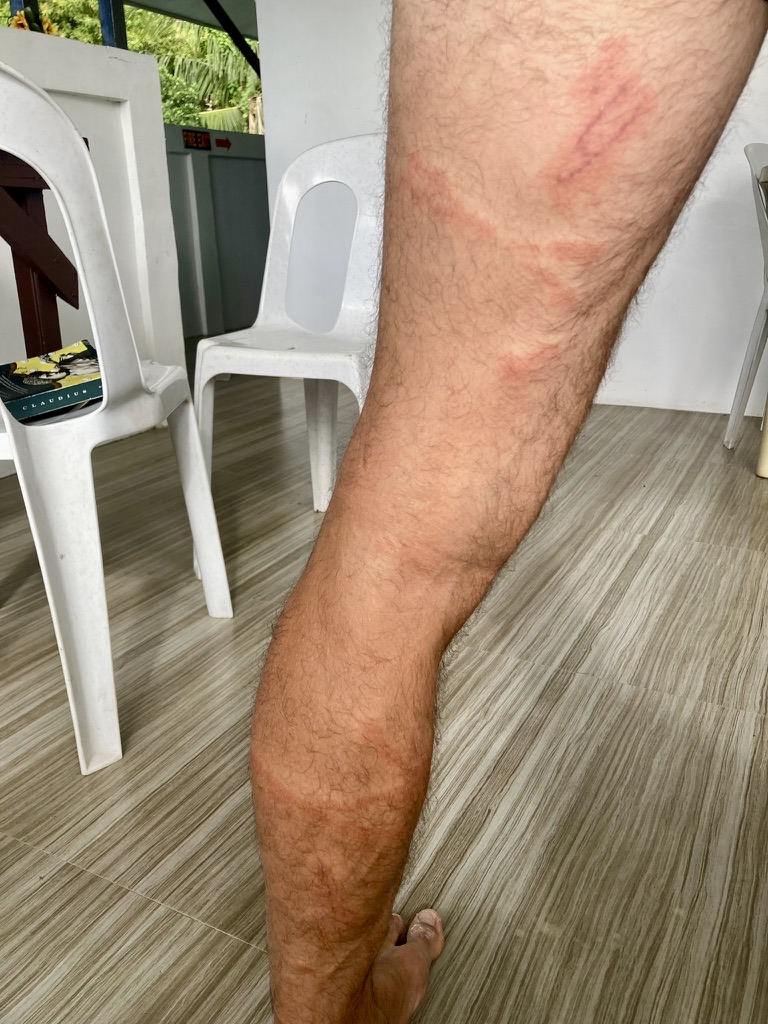 Claire managed to lead the kids back to safety, avoiding a few other stingers that she managed to spot in the water. Once on the beach, I wandered up to the nearest bar to ask them if they had any… vinegar. The nice folks at the bar had a bottle ready just for this, and sprayed my legs (to disactivate the stinging cells) and we removed the tentacles from my burning skin. When I noticed a few locals gathering around to see what was going on, and the barman talking about how it can be dangerous if you get stung near veins I suddenly thought: “wait, are these those tranparent box jellyfish… you know, the kind that sometimes kill people?”