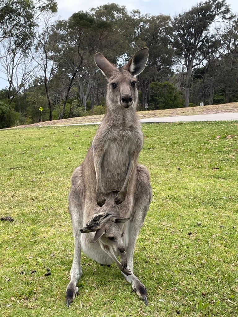 Notre deuxième petit arrêt à Pambula nous a permis une rencontre avec plusieurs kangourous qui semblent avoir le contrôle de la ville, dont une maman et son grand bébé.