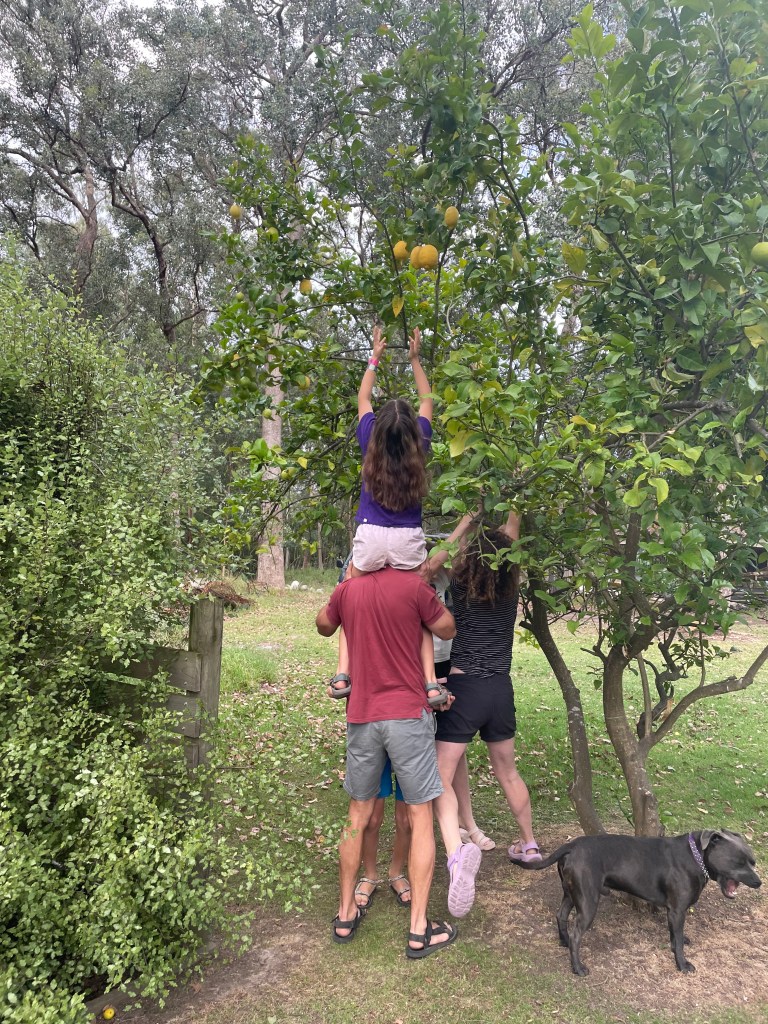 Nous sommes arrivé à un caravane Park à Nowa Nowa dans la plus grande noirceur. On se demandait ce qu’on avait bien pu réservé là, jusqu’à ce qu’on réalise que toute la ville avait perdu le courant! L’électricité est revenu bien vite et on a trouvé notre petite cabane avec 3 pairs de lits superposés. Parfait! Le lendemain, Elsie a cueillit un magnifique citron directement d’un arbitre sur la grande propriété!