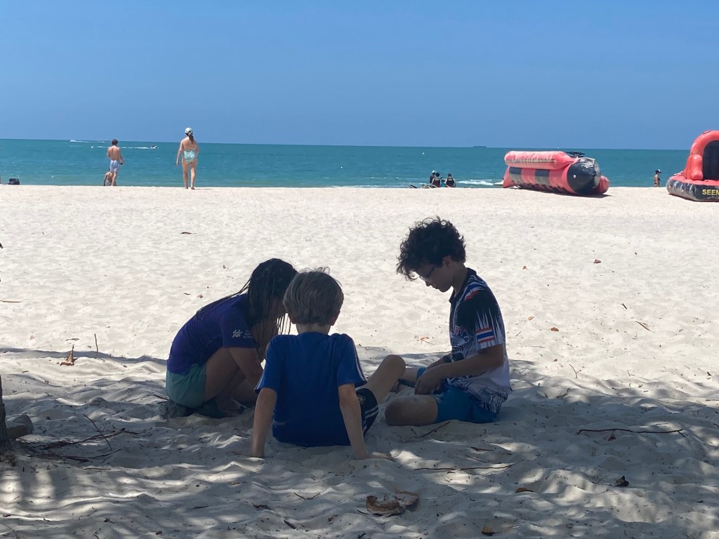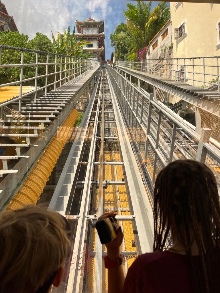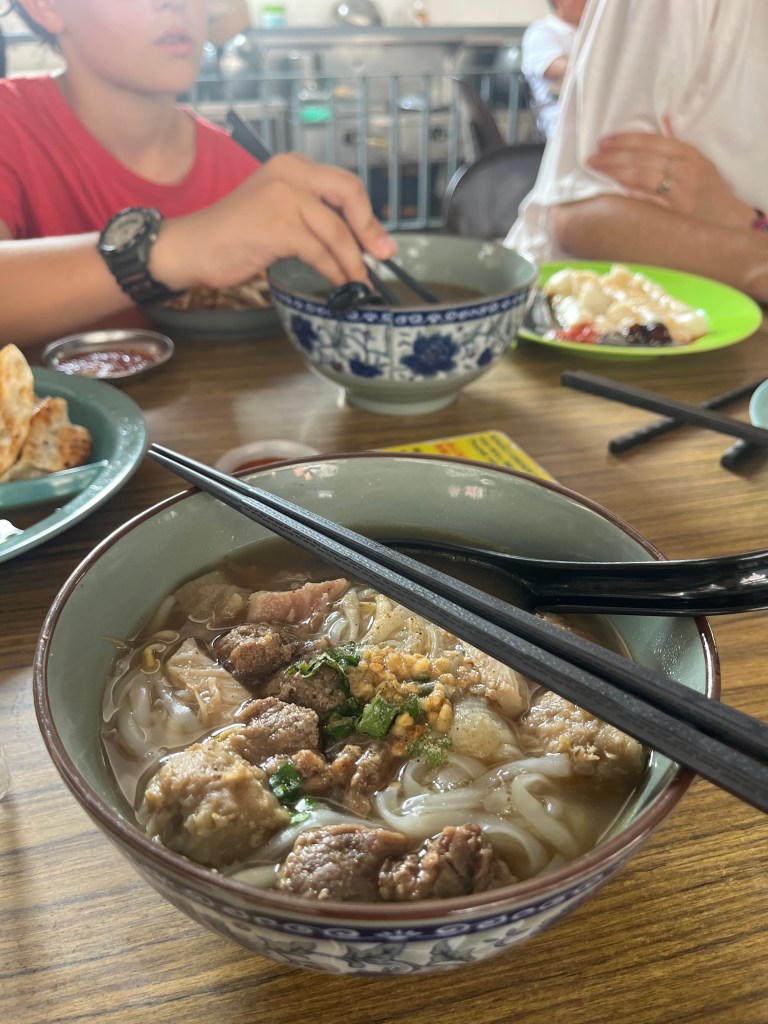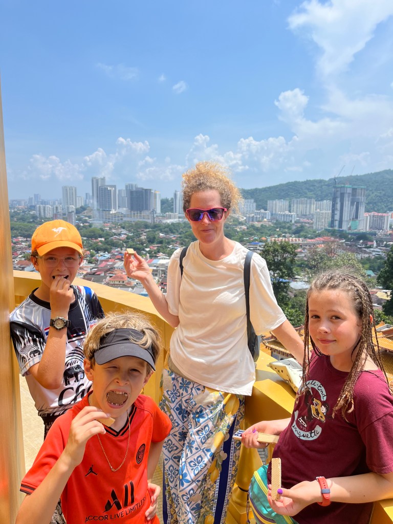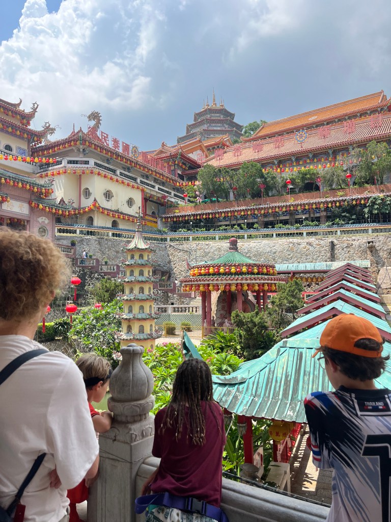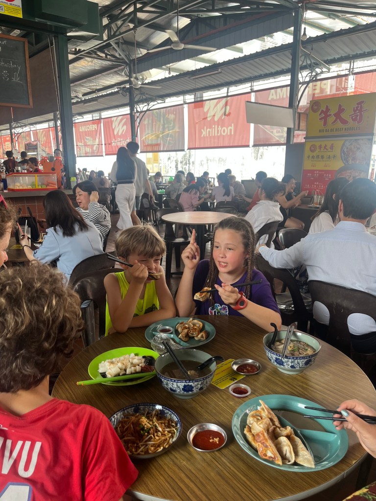J’adore trouver des Hawker stall, des aires ouvertes avec plusieurs tables entourées de petits chariots où différentes personnes offres quelques plats. On s’installe à une table, où on peut commander quelque chose à boire (ma découverte: une boisson composé d’orge, de citron et de sucre, avec des petites perles d’orge au fond!), puis chacun peut aller au chariot qui lui plait. Elsie, Ben et Mackaela trouvaient typiquement des dumpling, et Patrick, Henri et moi des nouilles ou de la soupe épicée. On a tellement bien mangé!! Penang a une grosse communauté chinoise, mais comme le reste de la Malaisie a aussi une communauté Malay et Indienne, ce qui offre tellement de choix de saveurs riches! On a passé des journées à manger de délicieux repas sur des petits bancs Fisher Price, puis avoir hâte d’avoir faim à nouveau!