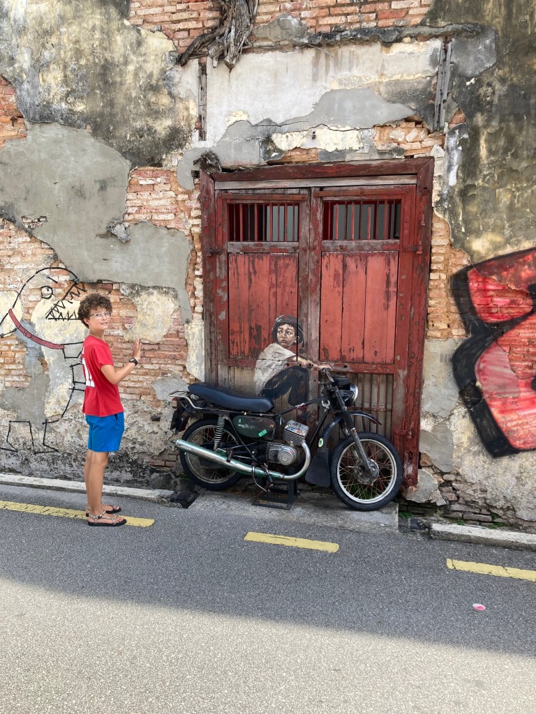 Ensuite venait l’arrêt dont Patrick et moi avions le plus hâte: Georgetown (Penang), une ville UNESCO que nous avons adoré en 2013. Nous sommes resté ici 4 nuits, ce qui est beaucoup pour notre rythme effréné! C’est une ville reconnue pour son art de rue et son offre culinaire, et nous avons profité des deux!