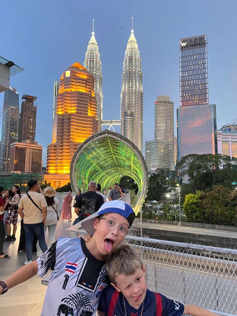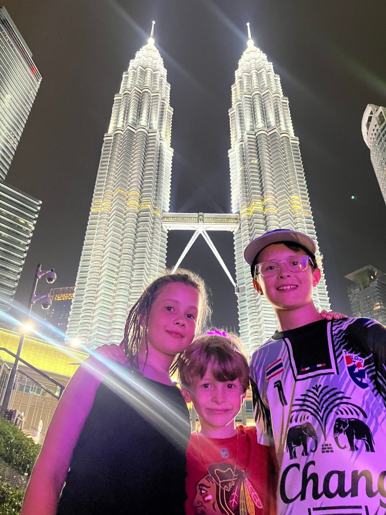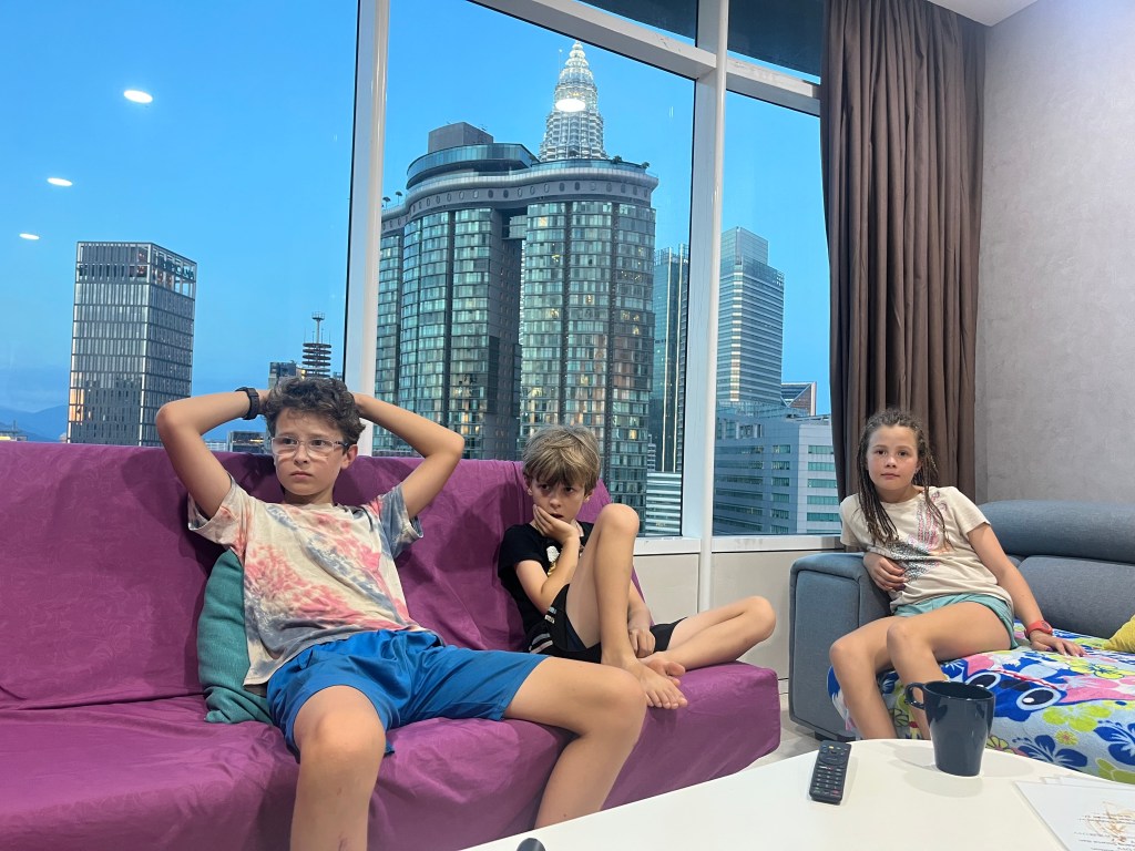 Après un voyage d’autobus interminable, où heureusement nous avons pu sortir à Bukit Bintag (Times Square) plutôt que de rester dans le traffic intense jusqu’à la station d’autobus TBS de l’autre côté de la ville (déjà-vue de Manille!) nous avons marché jusqu’à notre appartement près des Petronas Towers. Patrick a trouvé un super endroit pour nous! Un appartement à 3 chambres au 42e étage d’un édifice ovale en plein centre ville. Nous avons bien profité de la vue!