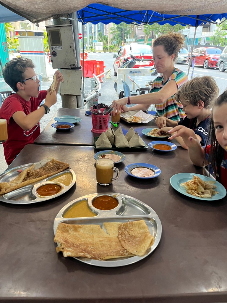 Pour notre première de deux journées à KL, on a fait un énorme tour de ville à pied! On est partie de notre édifice pour se rendre à Little India, où on a prit le petit déjeuner. On a trouvé un petit resto ouvert avec plusieurs locaux (toujours un bon signe), où on a prit des rôti cenai, des thosai et du thé. On a mangé les rôti et les thosai (différents types de crêpes) avec nos mains en les trempant dans différentes sauces. On a tellement aimé qu’on a refait le même déjeuner les trois matins suivants, à différentes places!