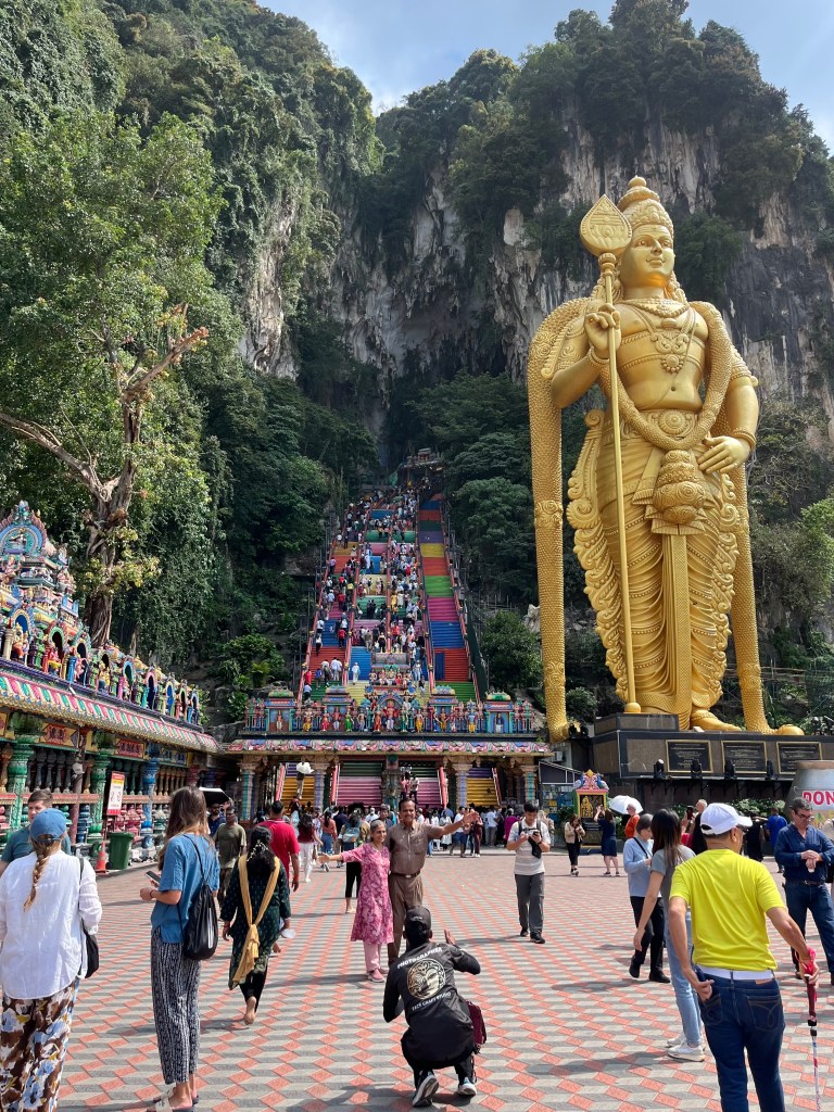 Le lendemain, on a visité les Batu Caves, un gros temple Hindu dans une cave à 373 marches colorées dans les aires. C’était super impressionnant! Des singes habitent la cave et rôdent près des touristes, qui les nourrissent même s’ils ne devraient pas… Il y a une autre cave à côté du Batu Caves qui a été aménagé pour raconter l’histoire de Rama et Sita, une histoire importante dans la religion Hindu. J’ai préféré cette cave à la cave principale. Une fois de retour en ville, nous avons trouvé l’autre Little India de Kuala Lumpur. Il me semblait en effet que le premier qu’on avait visité était trop petit pour la grosseur de la ville!