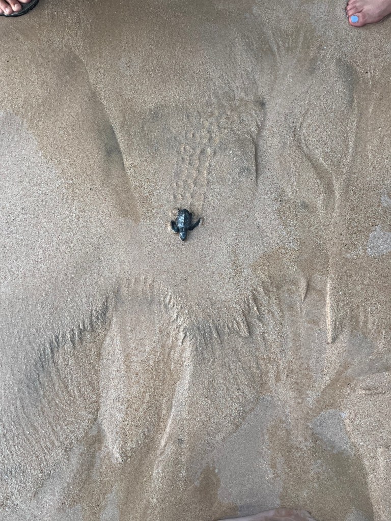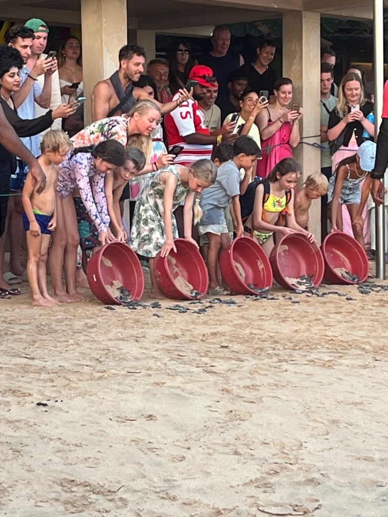 On était à la plage Unawatuna,et on a vu des bébés tortues 🐢et on a attendu que ils partaient à l’océan à 18h30. Le jour d’après on est allé à une autre plage Mirissa et on a vu d’autres tortues. C’était les sauveteurs qui s’occupaient de déménager les œufs de tortue, déterrer les tortues après plusieurs jours, et siffler pour éloigner les oiseaux quand les tortues marchaient vers l’océan. Il y avait un crabe aussi qui essayait d’attraper des tortues mais un des sauveteurs l’a chassé.