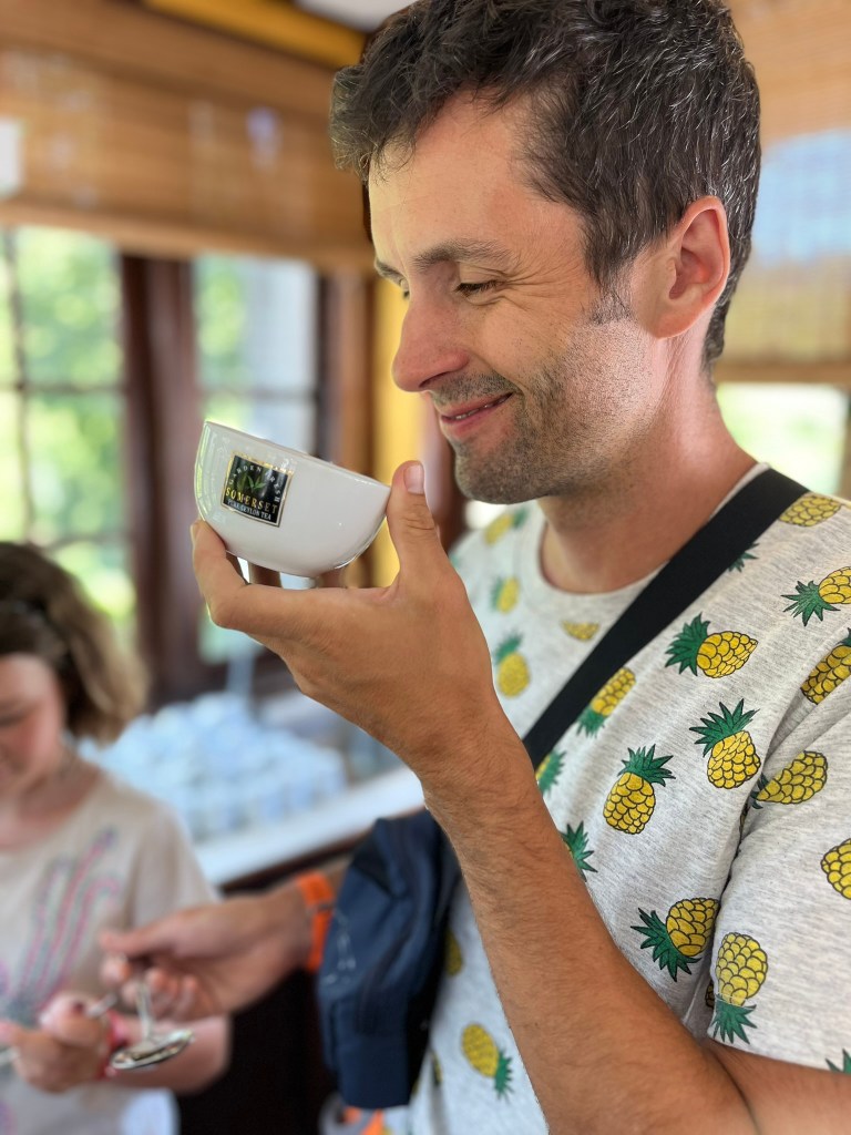 Sri Lanka (or * Ceylon * if you’re trying to sell a tourist something) is of course famous for tea, and we were in tea country, with hillsides covered by plantation estates. So one morning we grabbed a tuk-tuk out to Somerset Estates and did a tour of the Tea Factory. Our guide took us through the factory and explained the whole tea-processing operation. We learned a lot, helped by the fact that we’re not too shy to ask really dumb questions. Though the tasting of all of the different teas at the end was a bit disappointing (they were extremely bitter… maybe over-steeped?), the tour finished with tea and cookies in the shop, where the kids could put as much milk and sugar as they liked.