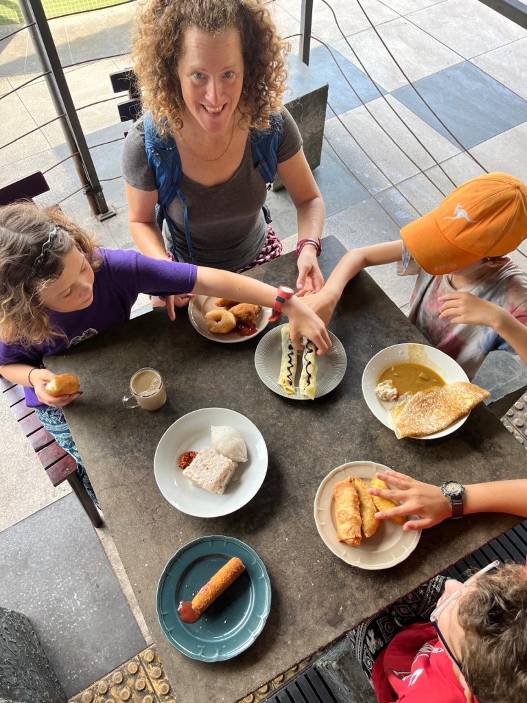 Un matin on est allé trouver un déjeuner. Dans le parc près du lac on a trouvé un comptoir déjeuner. Donc on regarde qu’est-ce qu’on veut manger et on prend des photos. On va les montrer à une caisse et il nous donne des papiers avec le numero et le truc qu’on veut manger et ensuite on paye. Après on va au comptoir où on a pris une photo et on montre le papier que la personne à la caisse a donner. Il te prépare ton truc tu le prends et tu vas manger. Ce n’est pas du tout chère et très bon. Il y avait des pancakes au chocolat et avec un truc au coconut, super bon. Le lendemain aussi on a mangé et on est parti prendre une auto pour nous rendre à Negombo.