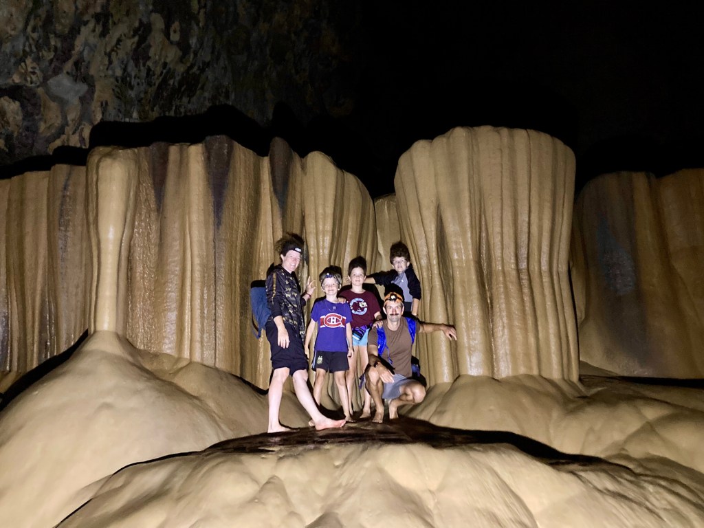 On est allé à la Sumaging Cave. Les roches étaient très glissantes et si on n’avait pas de lampe frontales on serait tombé. Les chauve souris avaient un nid au plafond. Il y avaient des formes dans la roche comme un lion, un gateau, un crocodile, et des dents. On est passé dans des petites rivières, mais on n’avait pas nos maillots. Pour remonter, on a utilisé des cordes à deux endroits. C’était le fun!