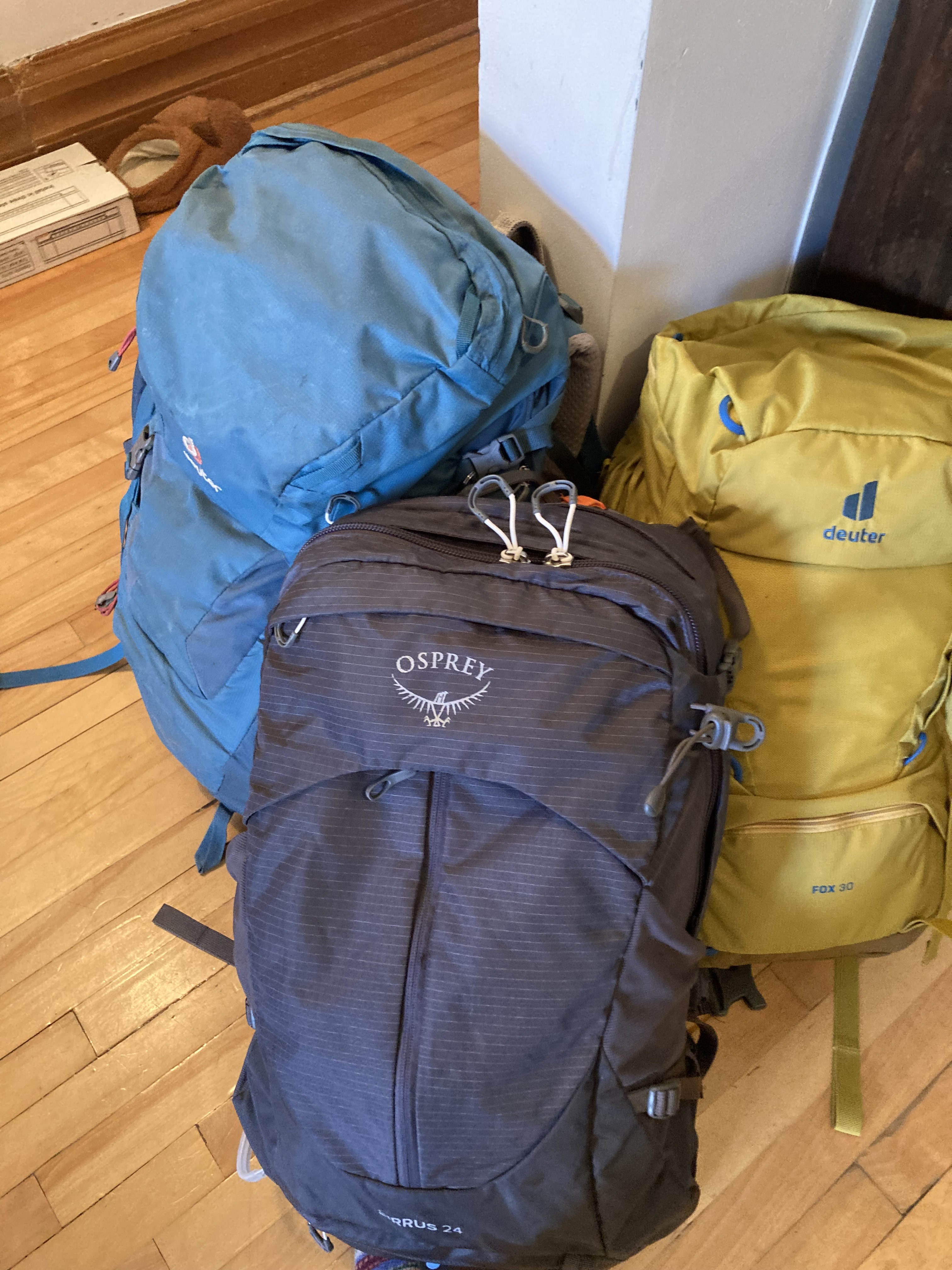 Henri a un sac Deuter Futura Pro de 38 L qui est loin d’être rempli à capacité. Elsie a un sac Osprey Sirrus de 24 L avec un peu d’espace, et Benoît a un sac grandeur enfant Deuter Fox 30 bien rempli.